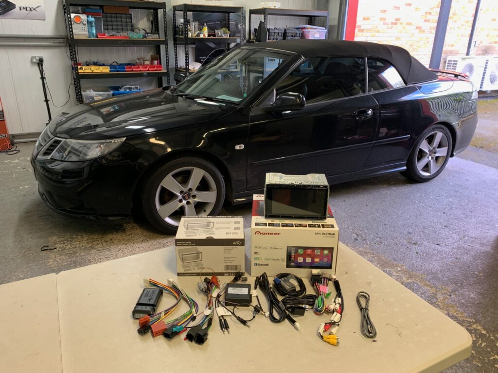 Saab 9-3 2010 model upgraded with the Pioneer SPH-DA77DAB wireless Car Play stereo.