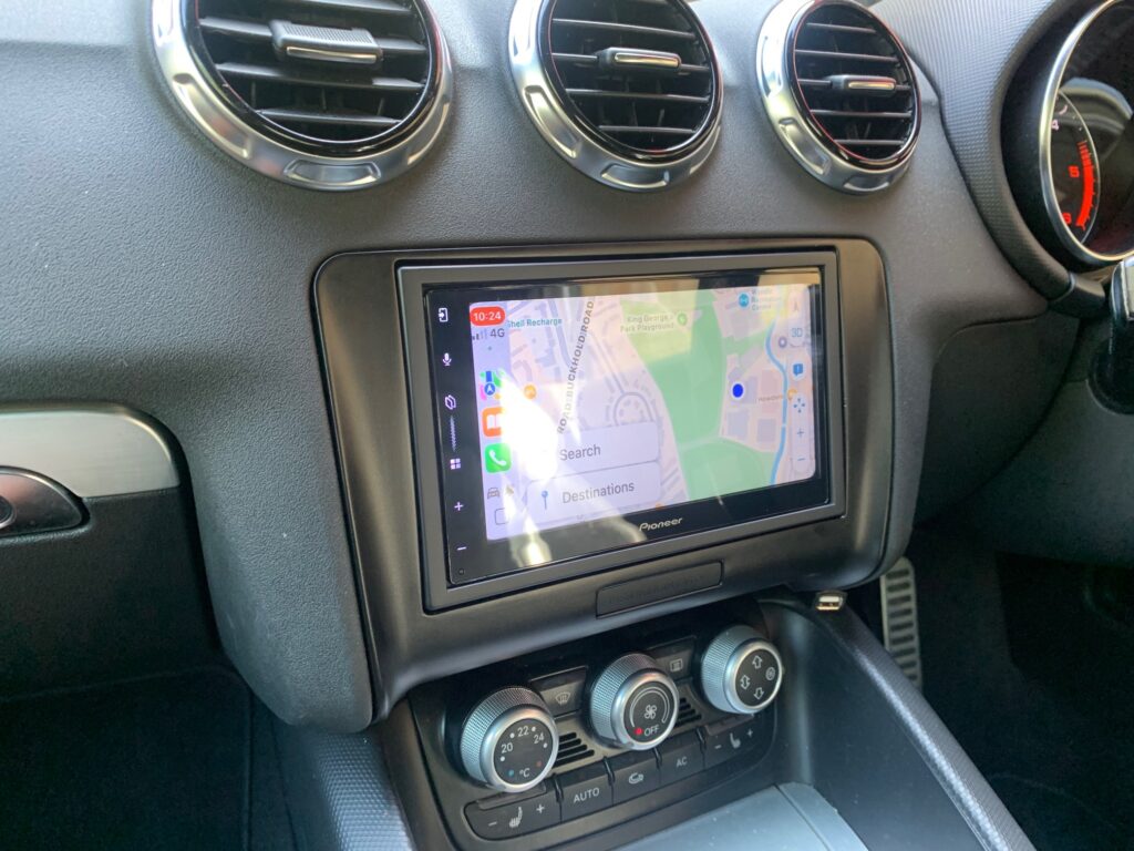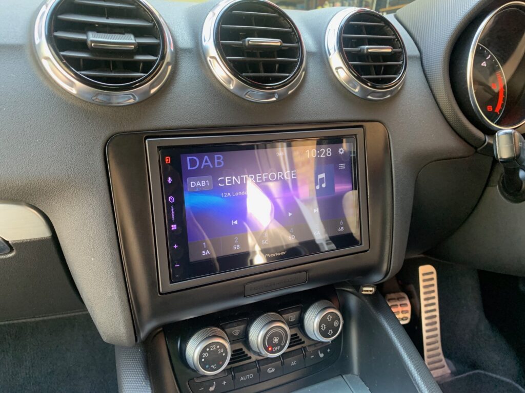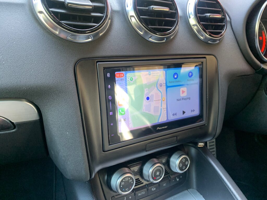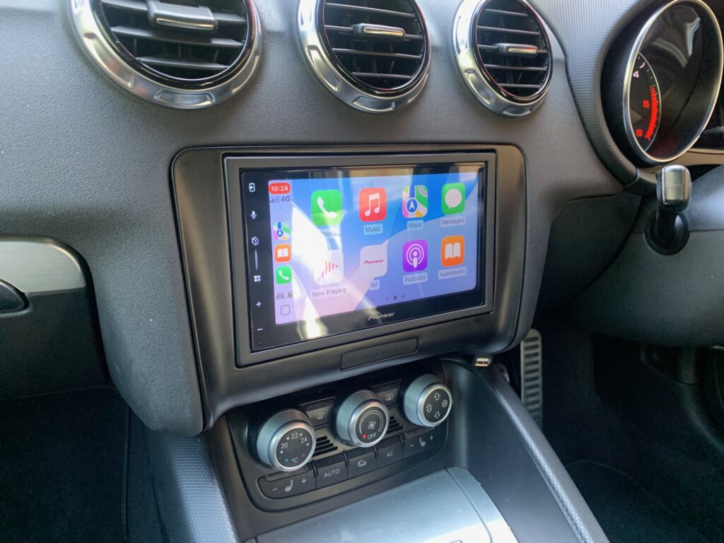 Audi TT Convertible 2011 model upgraded with the best stereo on the market, the Pioneer SPH-DA77DAB Wireless CarPlay stereo. An ACV fitting kit was used to complete the installation, the kit includes the fascia panel and the steering wheel adaptor which retains the volume controls on the steering wheel.