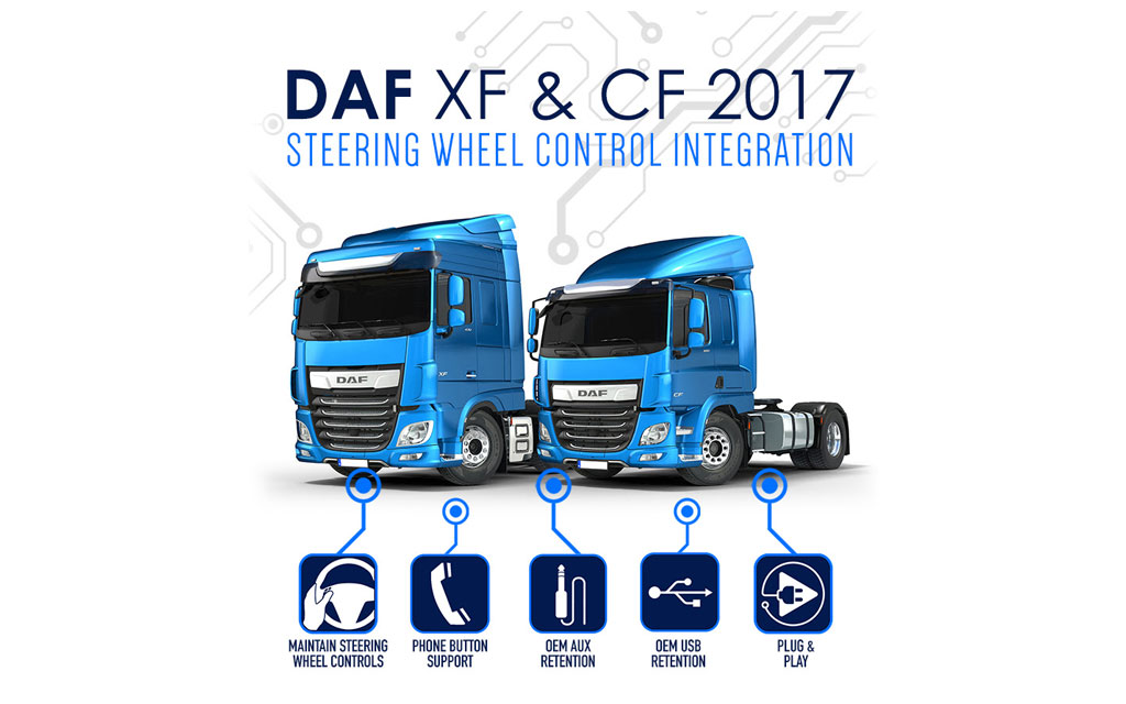 Connects2 newly developed interface maintains the steering wheel controls, Aux and USB ports when fitting an aftermarket radio in a DAF XF or CF 2017...