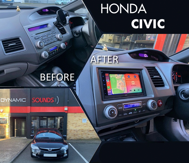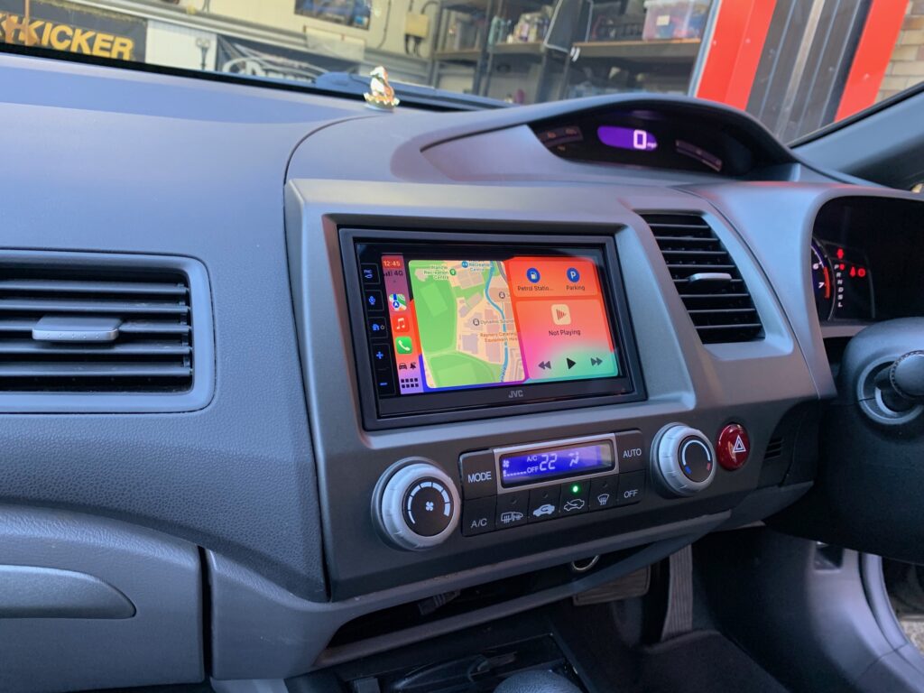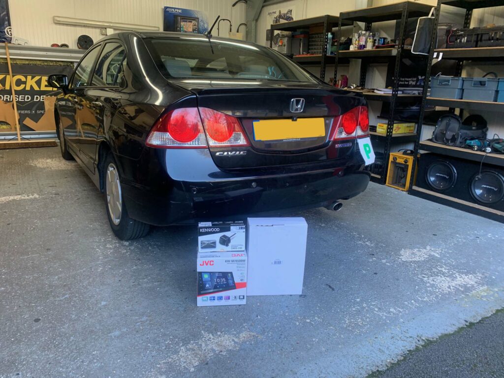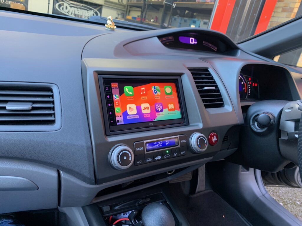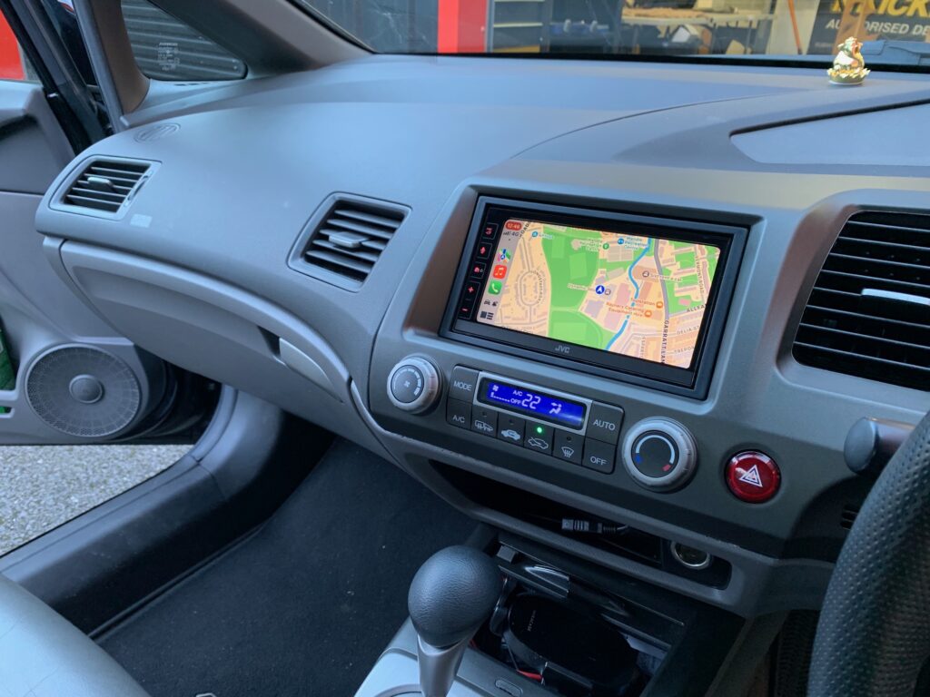 Honda Civic Hybrid 2008 model upgraded with JVC KW-M785DBW CarPlay stereo using the Connects2 CTKHD02 installation kit. We also installed the Kenwood CMOS-230 reversing camera. We mounted the DAB aerial on the front screen for the best reception for DAB signal.