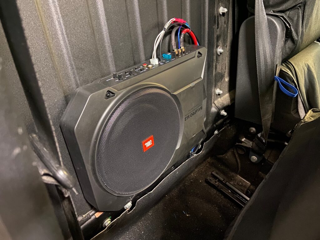 Peugeot Partner 2019 model upgraded with Pioneer TS-A1600C speakers and JBL BASSPRO SL2 Mounted to bulkhead behind drivers seat.