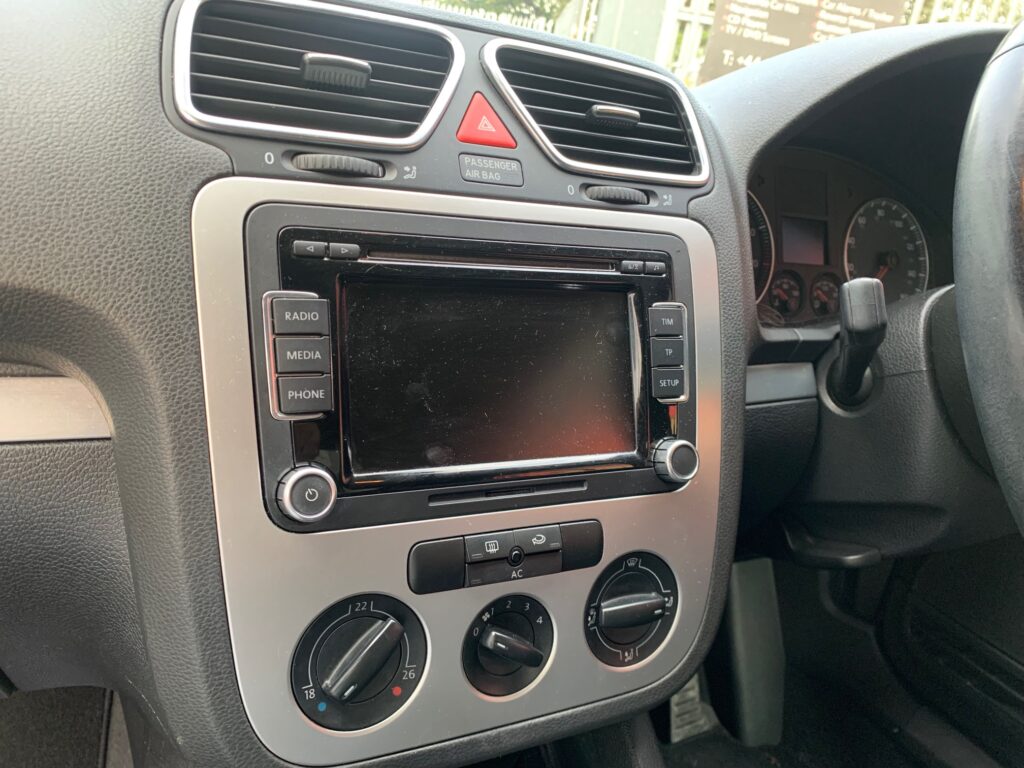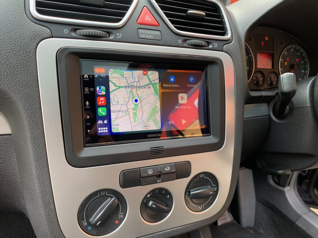 VW EOS 2009 model upgraded with Kenwood DMX7722DABS CarPlay stereo using the Connects2 CTKVW18 installation kit. The kit comes with the fascia and steering wheel adaptor which retains the volume controls on the steering wheel.